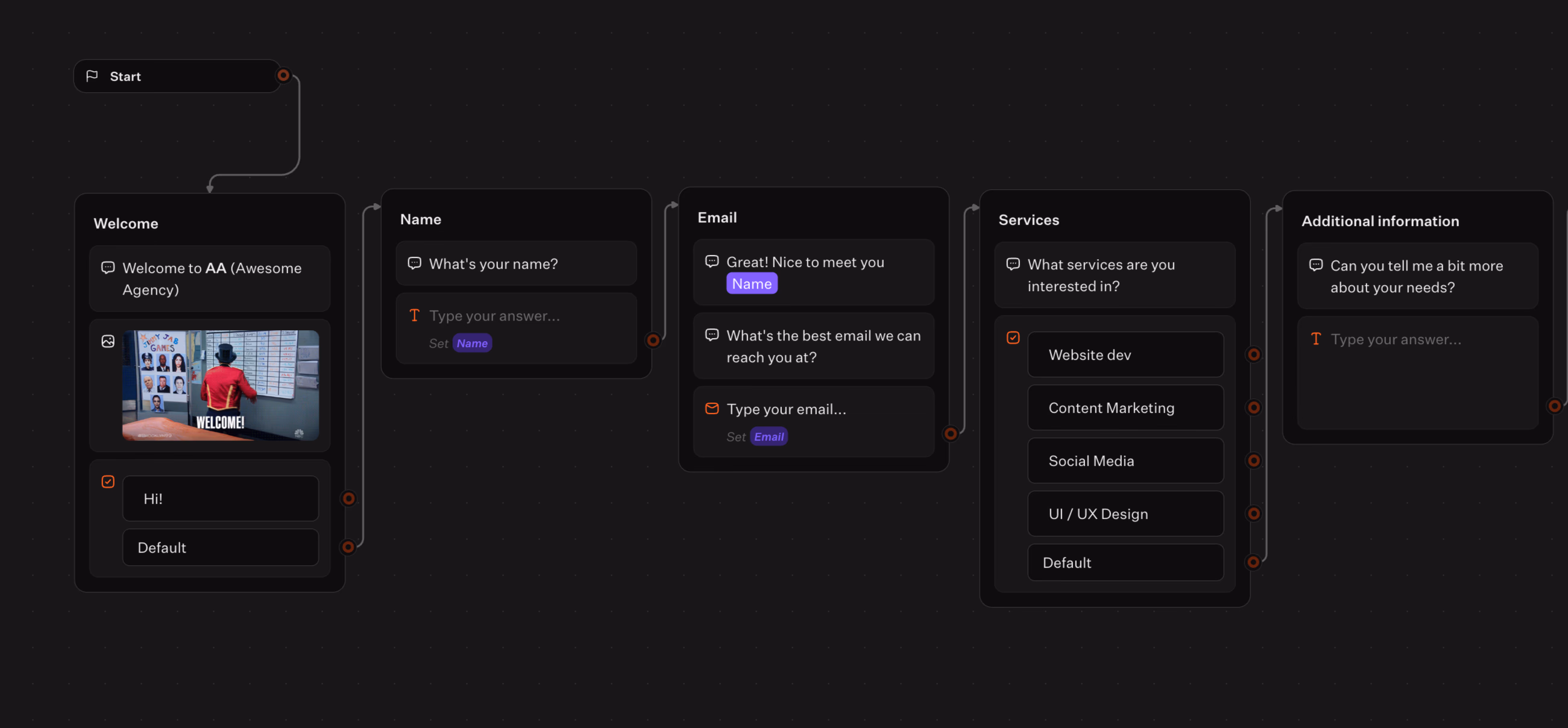 - Inputs to collect data (including Text, Email, Phone, Buttons, Cards, Website, Number, Rating, File)