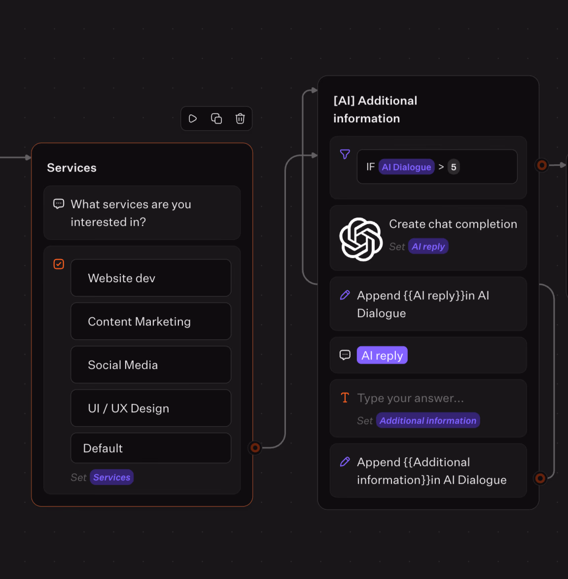 - Call the OpenAI integration when you want a smart follow-up based on previous answers.
