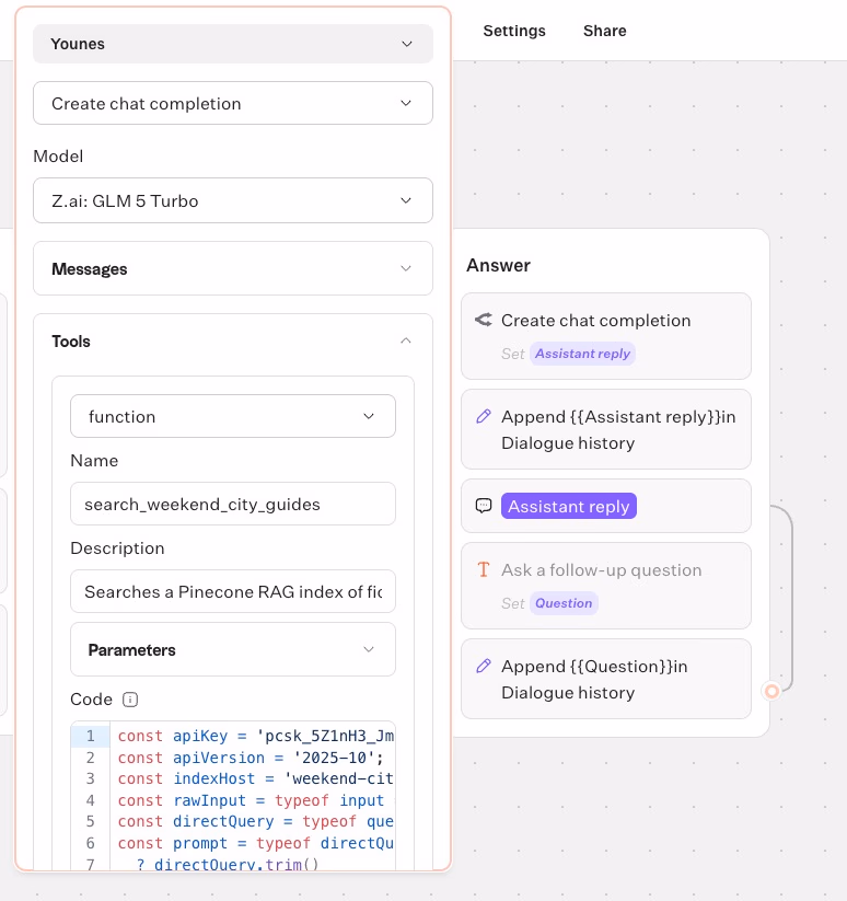 When these pieces are ready, building in Typebot is straightforward. You assemble a small conversation loop, store dialogue history, and let the model call Pinecone for retrieval before replying.