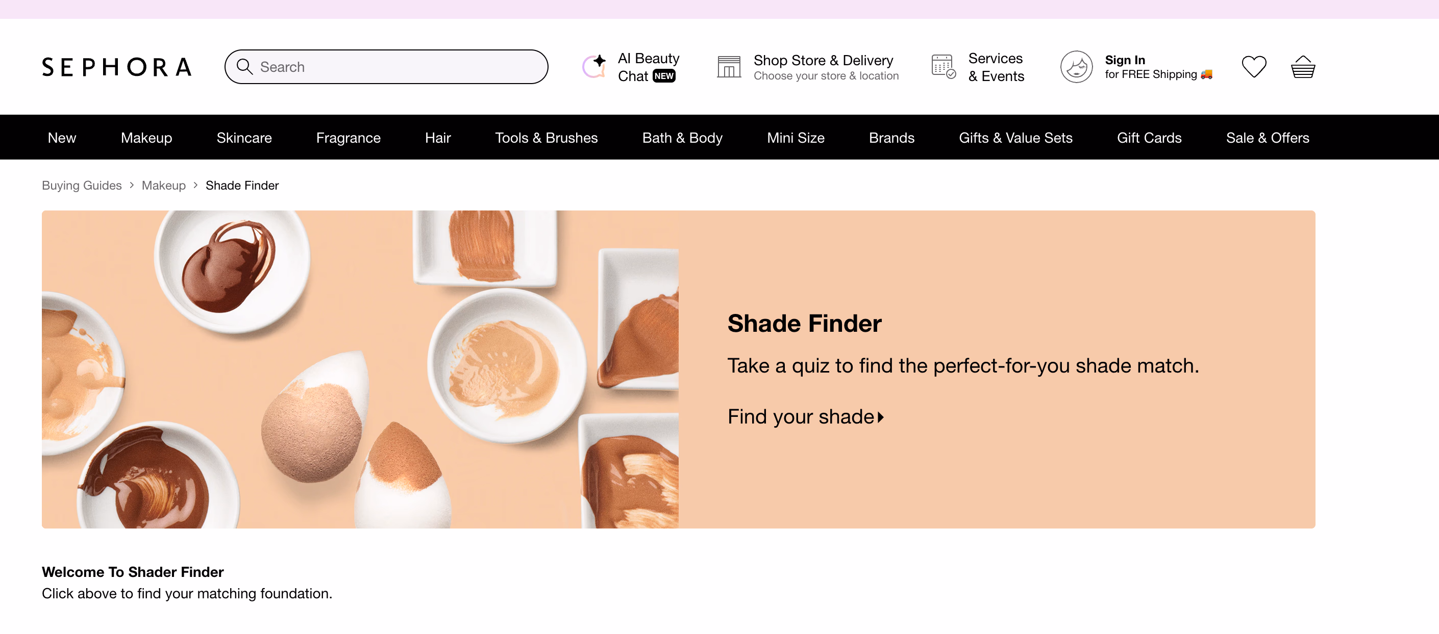 The quiz replaces a simple search bar with a step-by-step interactive experience. Instead of guessing shade names, users answer questions about their skin tone, undertone, and coverage preference. This is mimicking a knowledgeable in-store consultant.