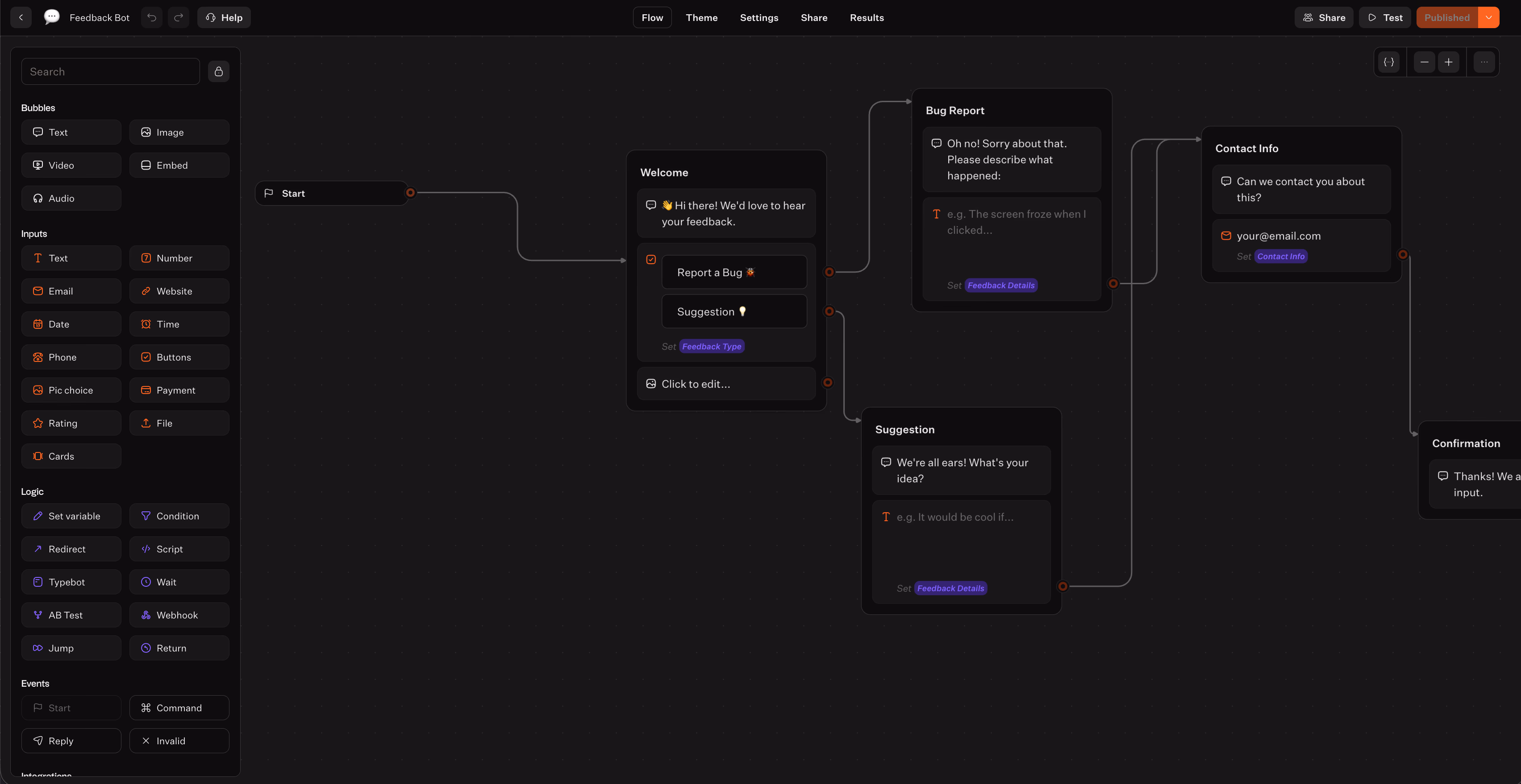 The next step is turning that burning question into a flow. Typebot's editor makes this intuitive. Instead of code, you get a visual map of your conversation. Start by dragging and dropping "Bubbles" for your questions. Keep the quiz dynamic.