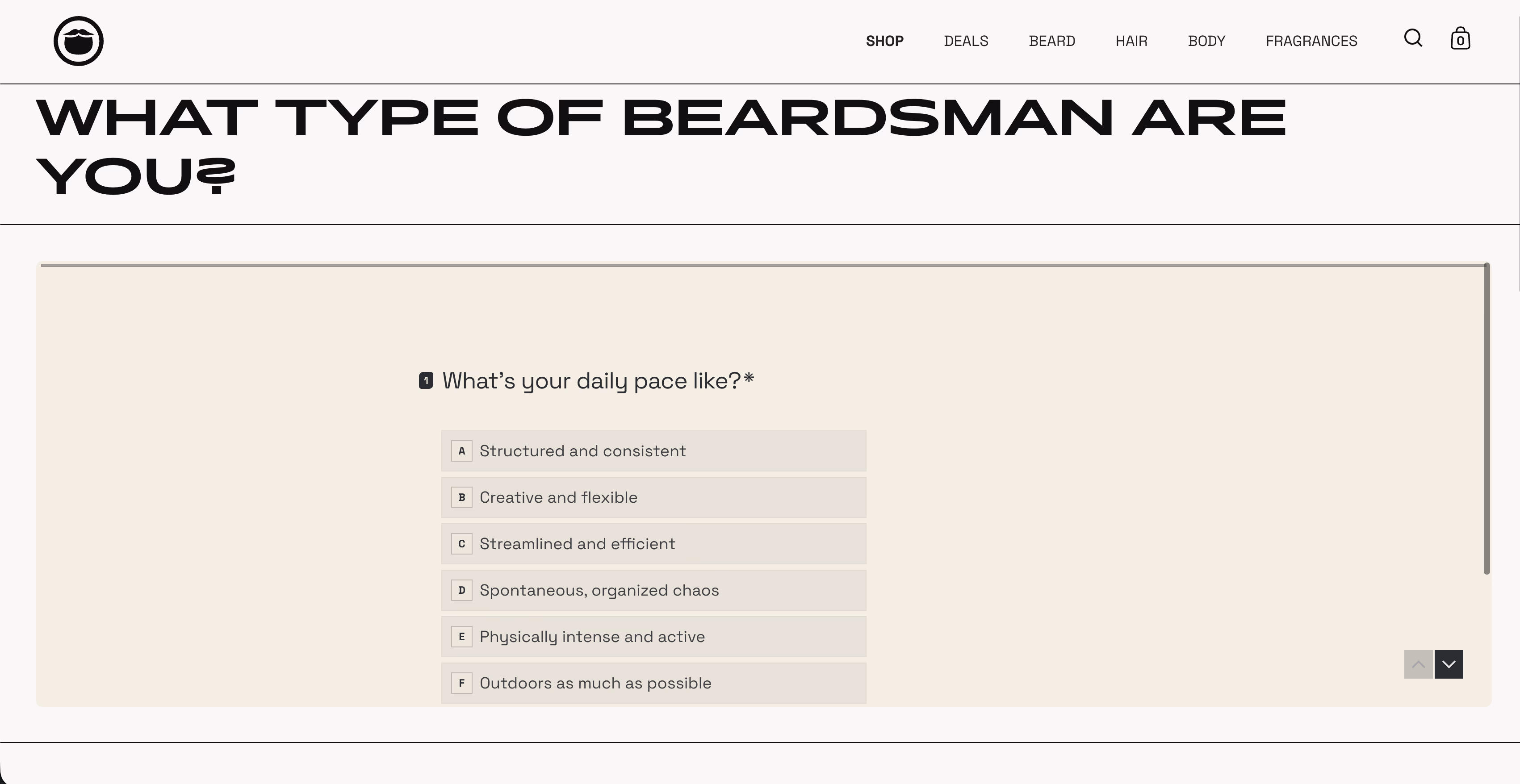 Most e-commerce brands create boring quizzes focused only on utility. Beardbrand changed this by turning their quiz into a game—an identity engine that asks "What type of beardsman are you?"